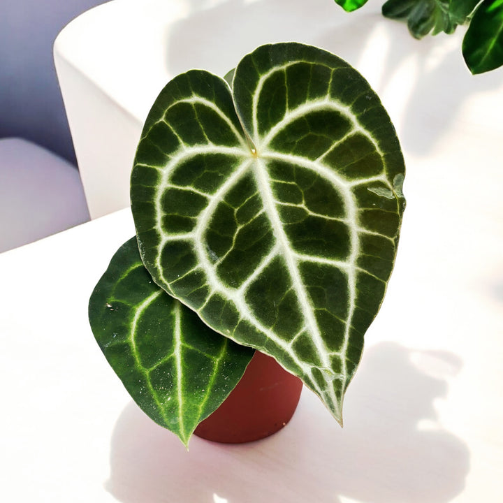 Anthurium clarinervium este o specie spectaculoasa, iubita de colectionari pentru frunzele sale in forma de inima, catifelate la atingere, cu un contrast puternic intre verdele inchis si nervurile argintii pronuntate. Este o planta tropicala de exceptie, originara din padurile din sudul Mexicului, unde creste ca epifita pe trunchiurile copacilor, intr-un mediu cald si umed.
