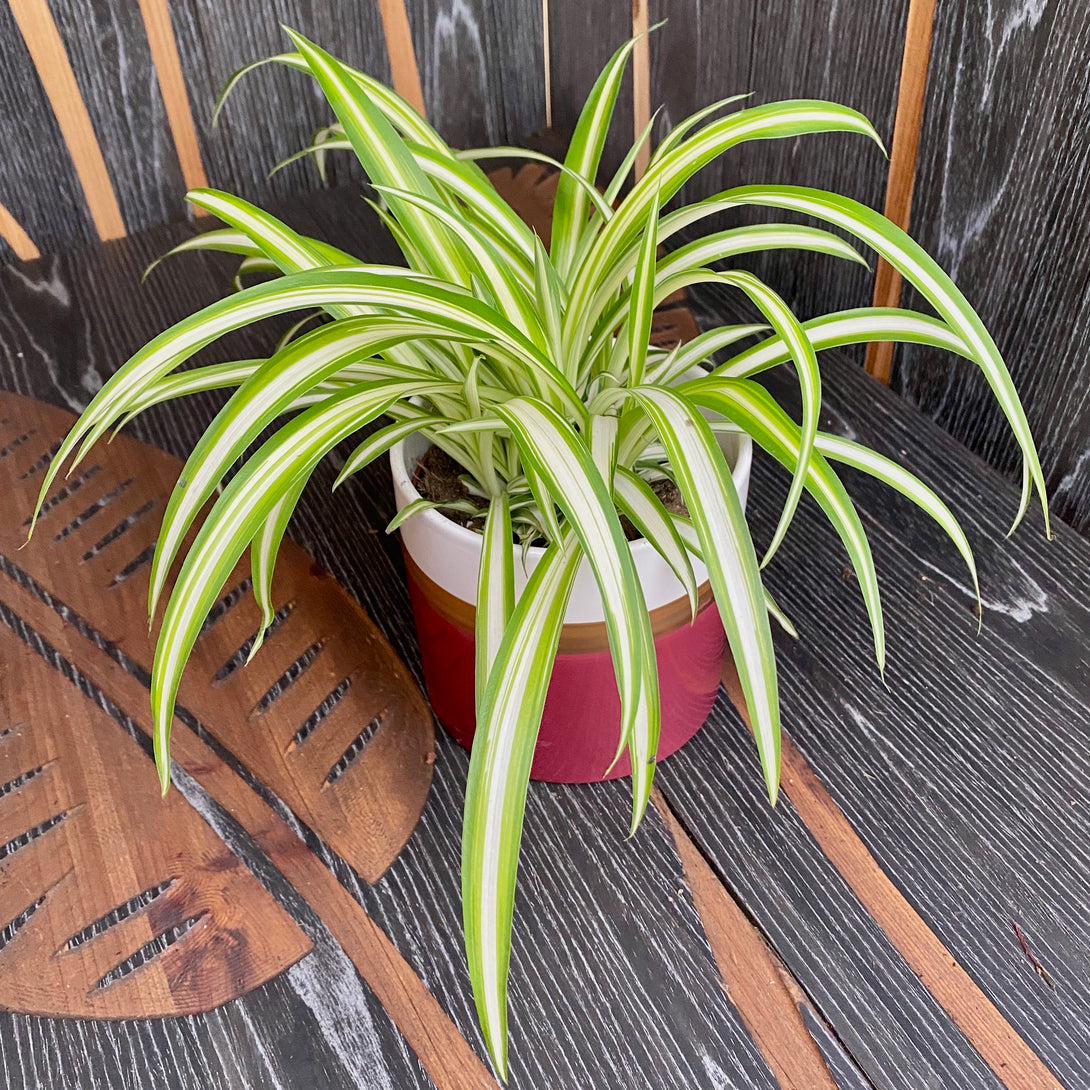 Chlorophytum comosum ‘Variegatum’, cunoscuta popular ca planta-paianjen, iarba de avion sau crin verde, este una dintre cele mai iubite plante de interior datorita aspectului sau elegant si a rezistentei remarcabile. Frunzele lungi, arcuite, de culoare verde cu margini albe-crem, formeaza o rozeta compacta si viguroasa. Pe masura ce creste, planta produce stoloni lungi care poarta mici rozete – adevarate „puiuti” usor de inmultit.