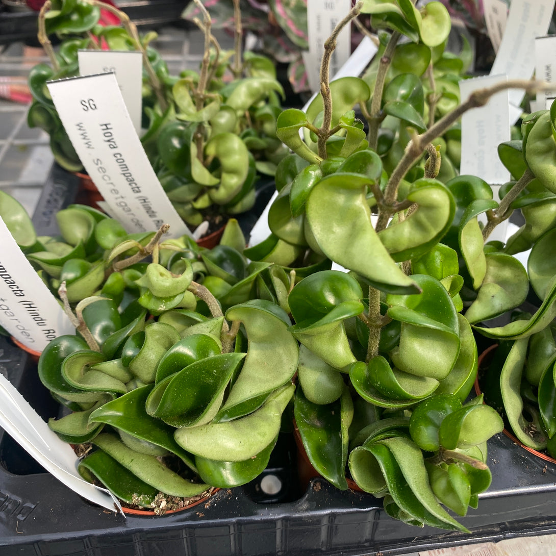 Hoya Compacta, cunoscuta si ca Hoya Hindu Rope sau Hoya monstruosa. Este o planta cu liane pendante, compacte, acoperite de frunze rasucite de culoare verde inchis, ocazional cu splash argintiu.